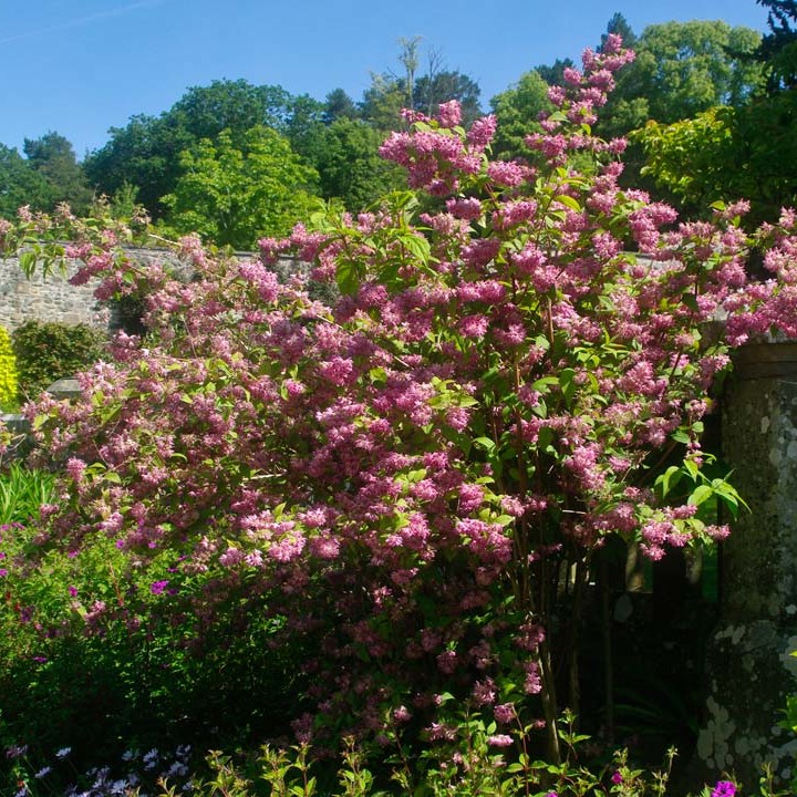 Deutzia hybrida 'Strawberry Fields' 난형의 녹색 잎을 가진 덤불 같은 중간 크기의 낙엽 관목입니다. 붉은 꽃봉오리가 열리고 별 모양 꽃의 가볍게 향기로운 원추형 원추꽃차례가 생기며, 너비는 2.5cm이고, 바깥쪽은 진한 분홍색, 안쪽은 옅은 분홍색에서 흰색이며, 5월에서 6월에 나타납니다. 산골짜기나 돌틈에서 주로 자라던 식물로 정원이나 조경, 스톤 가든 및 야생의 조경 소재로 사용하기 좋고 풍성한 덤불형이라 군락식으로 조경하기 좋습니다. |