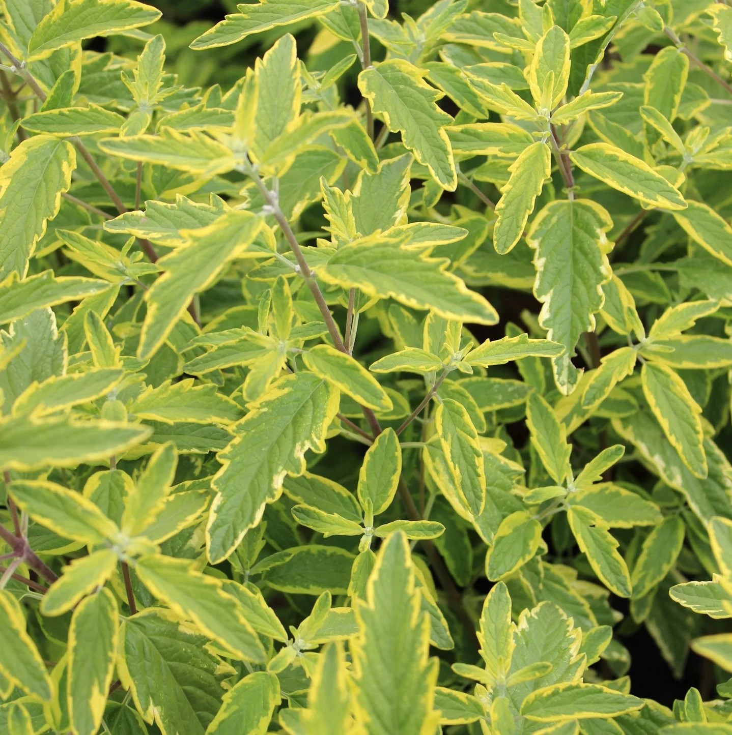 잎 가장자리에 선명한 황금색 테두리가 둘러진 화려한 무늬종입니다. 층꽃나무 특유의 청량한 꽃색과 잎의 황금빛 대비가 일품이며, 개화 전에도 잎 자체의 관상 가치가 압도적이어서 봄부터 가을까지 정원을 밝게 유지해 주는 '컬러 리프'의 대표 주자입니다.
