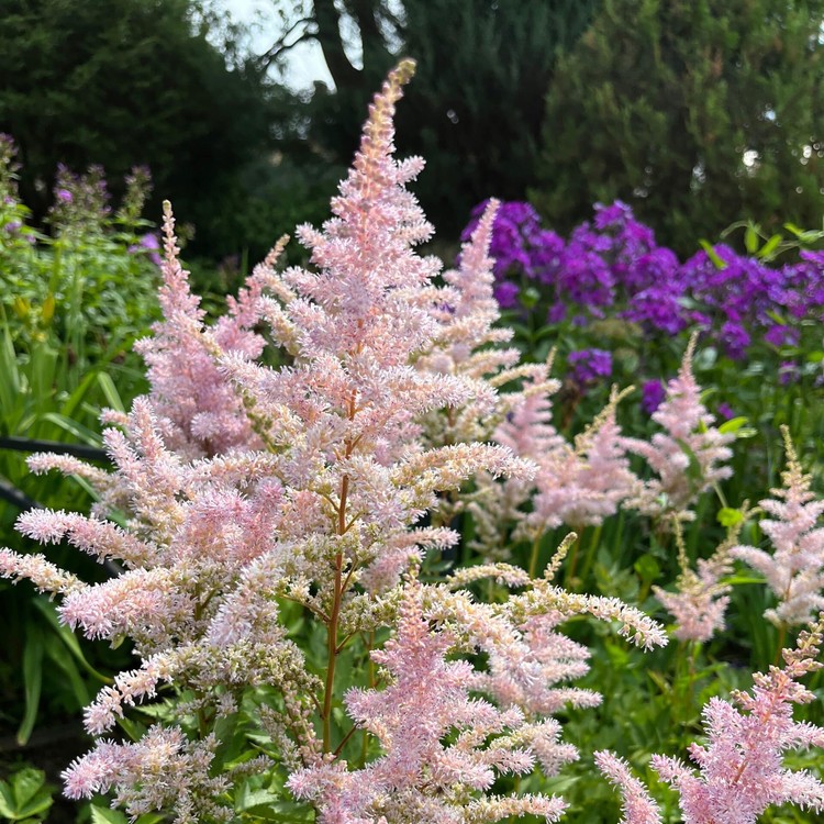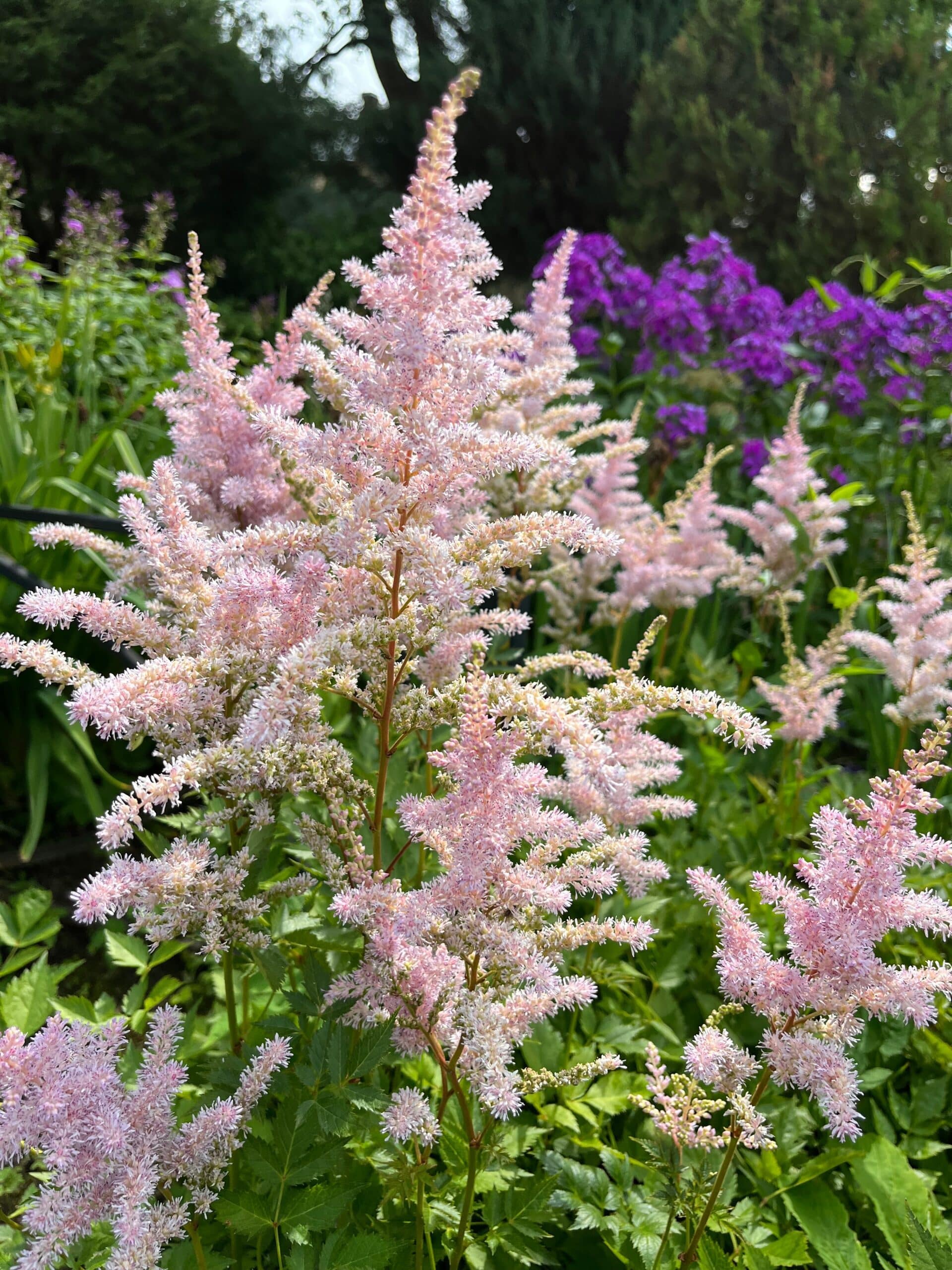 잎이 넓고 매끄러운 식물 옆에 심으면, 아스틸베 특유의 잘게 갈라진 잎과 깃털 같은 꽃이 시각적으로 강력한 대비를 이루어 정원의 깊이감을 더해줍니다.