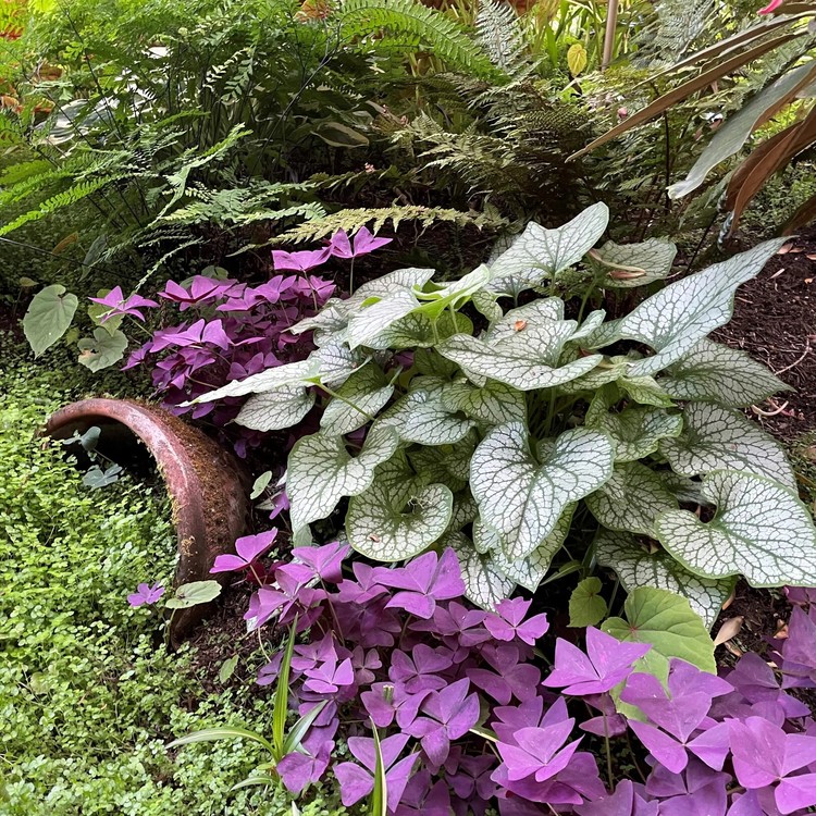잎이 잘게 갈라진 '아스틸베'나 '고사리류' 옆에 심으면, 브루네라의 넓고 매끈한 하트 잎과 극명한 대비를 이루어 매우 감각적인 정원 풍경을 만듭니다.