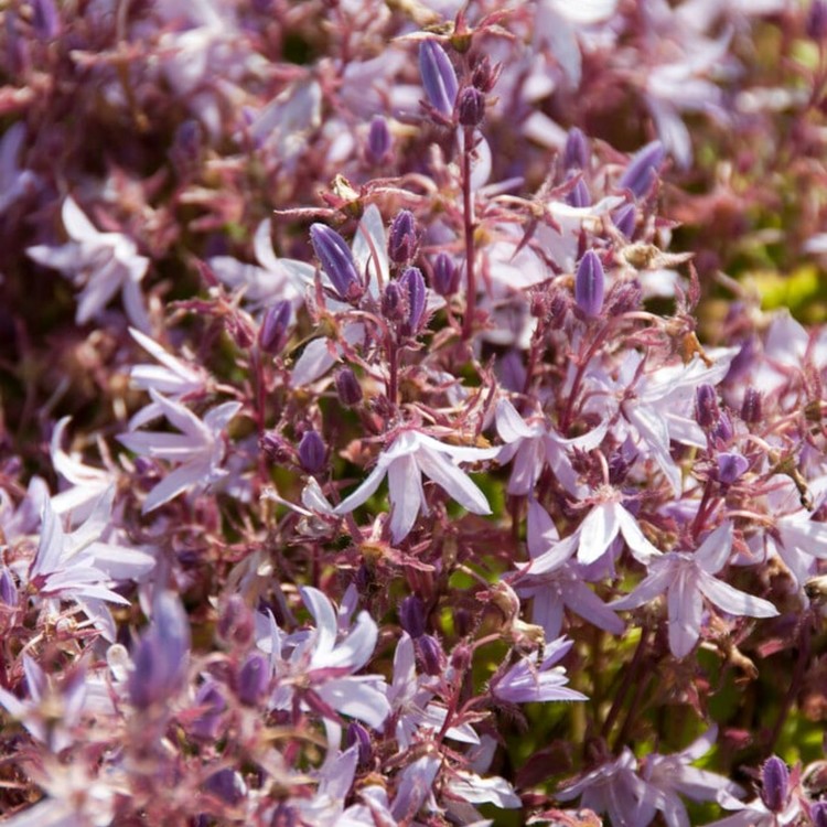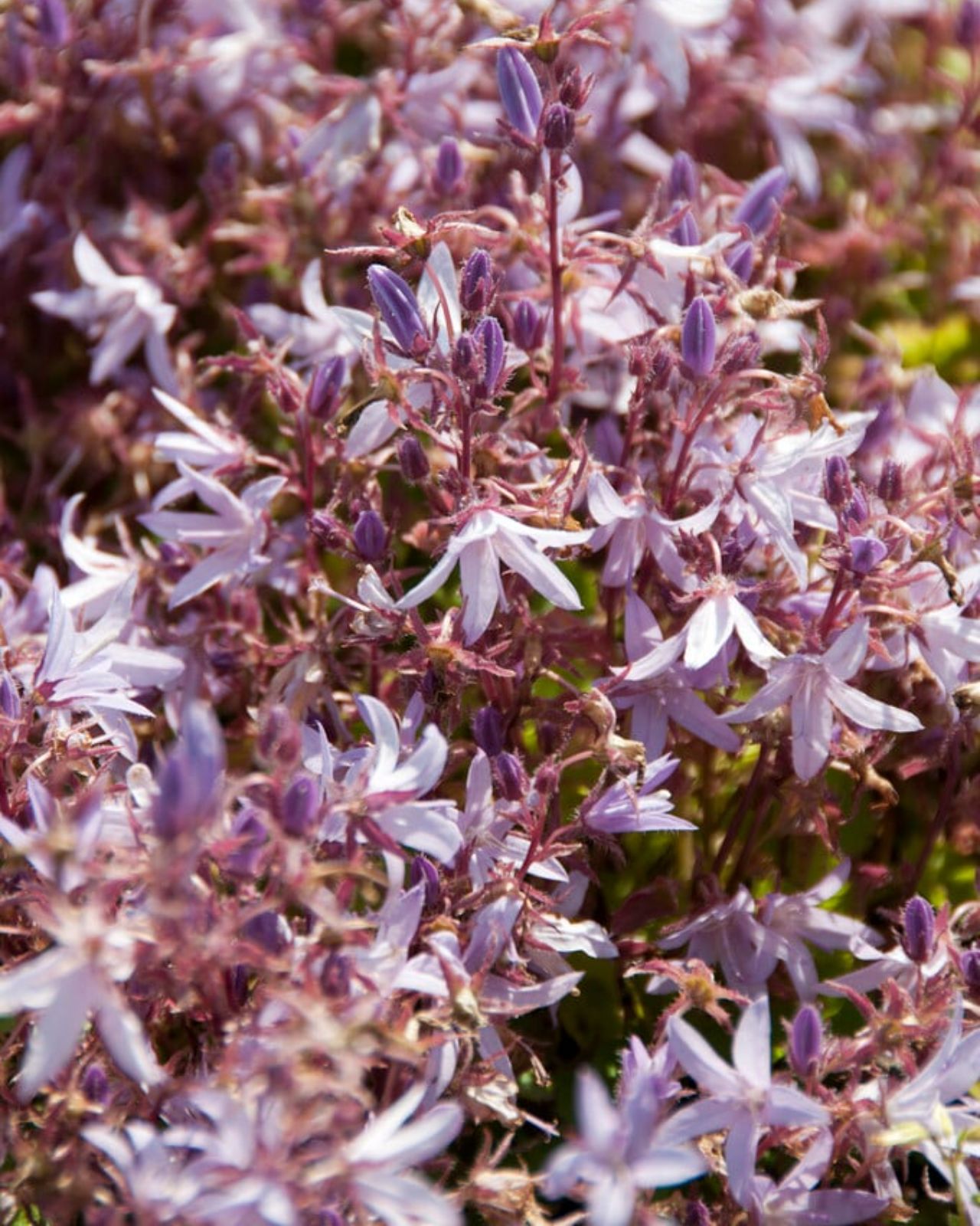 6월에서 7월 사이, 줄기 전체를 뒤덮을 정도로 수많은 별 모양의 꽃이 피어납니다. '리스더건'만의 따뜻한 느낌이 섞인 로즈 라벤더 색상은 차가운 보라색 캄파눌라와는 또 다른 포근하고 사랑스러운 분위기를 선사합니다.