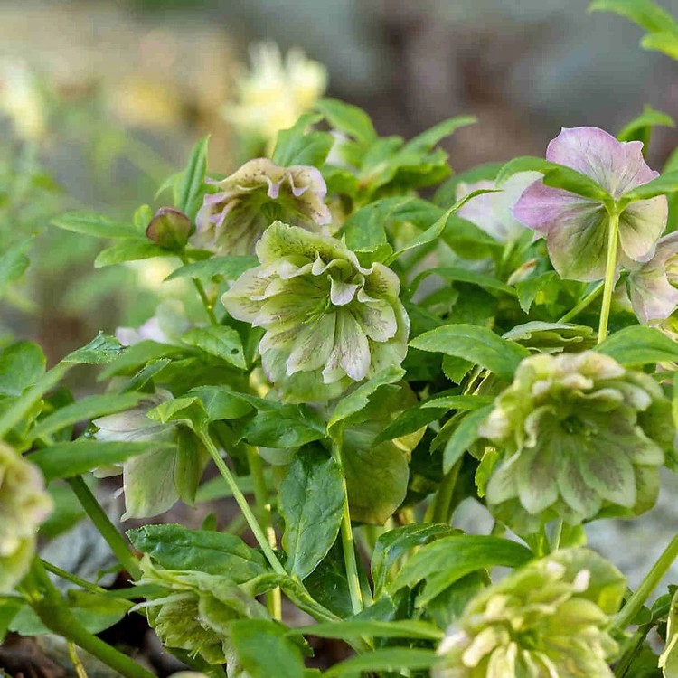 추운 겨울을 뚫고 피어나는 헬레보루스 중에서도 겹꽃의 화려함과 싱그러운 라임 그린빛 색감을 동시에 갖춘 품종입니다. 꽃이 귀한 2월에서 4월 사이, 마치 정교하게 접은 종이꽃 같은 초록색 꽃을 피워 정원가들에게 설렘을 선사합니다. '더블 엘렌' 시리즈는 꽃이 아래를 향하지 않고 정면이나 약간 위를 향해 피는 경향이 있어 감상하기에도 매우 좋습니다. |