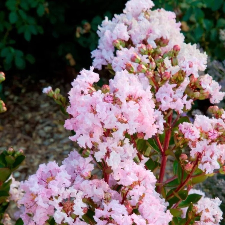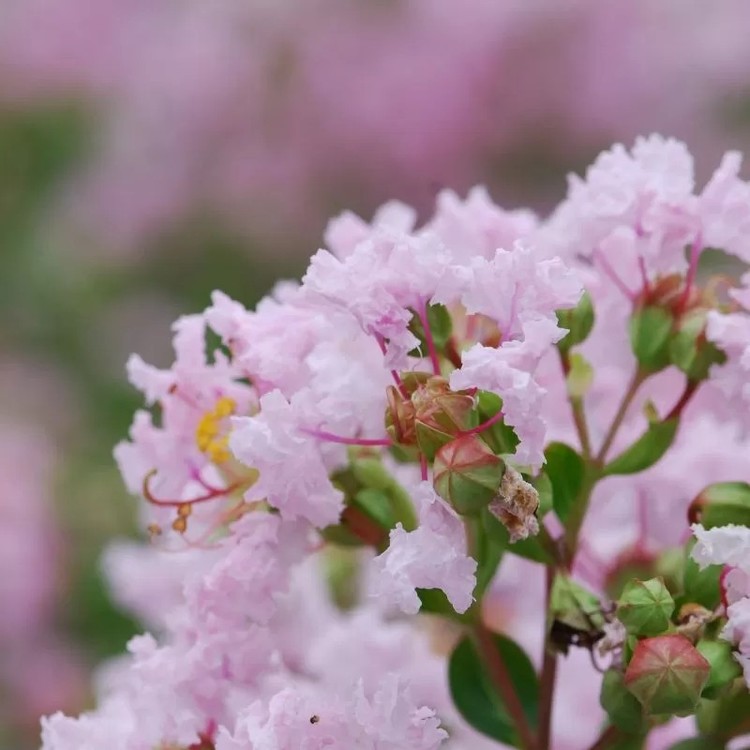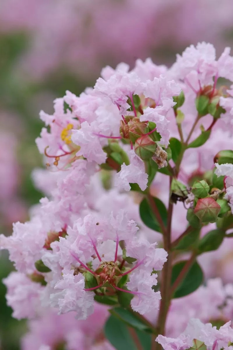 마치 잘게 주름진 종이를 겹쳐놓은 듯한 섬세한 질감의 연분홍색 꽃이 가지 끝에 뭉쳐서 피어납니다. 7월부터 시작해 첫서리가 내리기 전까지 오랫동안 개화하며, 여름철 꽃이 귀한 시기에 정원을 환하게 밝혀줍니다.