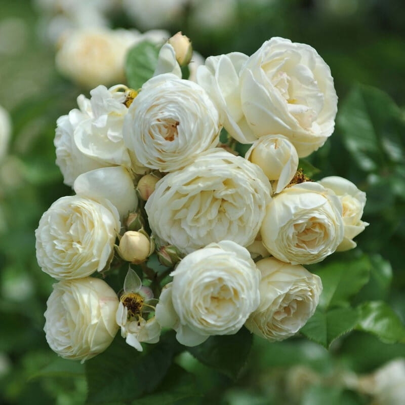 화색 및 화형: 우아하고 맑은 크림 화이트(크림 백색) 색상을 띠며, 바깥 꽃잎으로 갈수록 은은한 그린빛이 감돌아 신비로운 느낌을 줍니다. 고전적인 올드 로즈를 연상시키는 동그랗고 앙증맞은 구형(Globular, 공 모양) 화형으로 피어나며, 한 줄기에 여러 송이가 다발로 모여 피는 5~8cm 크기의 중륜 장미입니다.